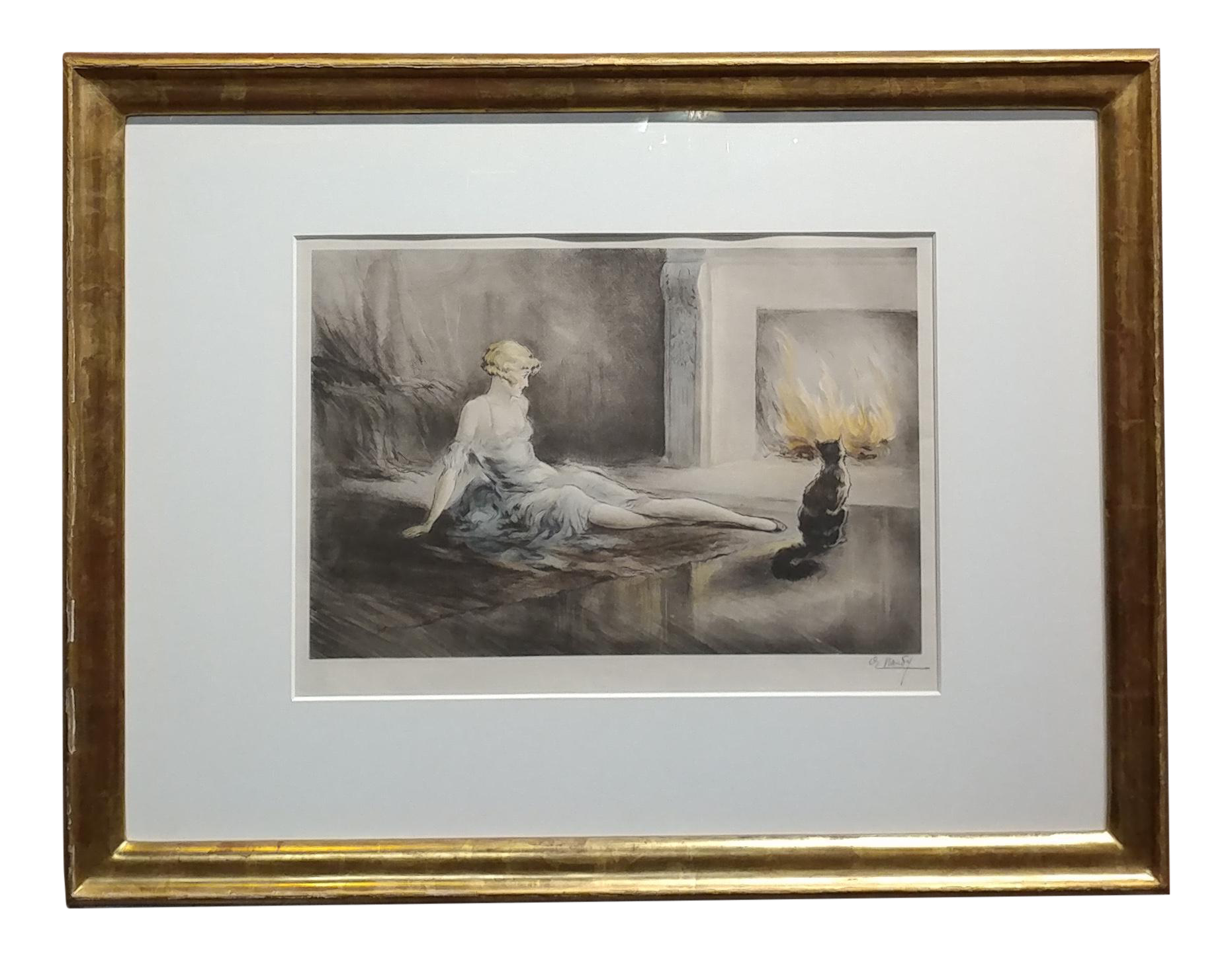 E Naudy 1920s Art Nouveau Woman W Cat By Fireplace Lithograph