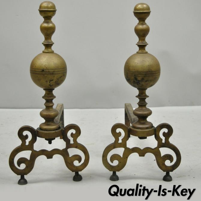 Antique Vintage Brass Cannonball Cast Iron Fireplace Andirons Fire