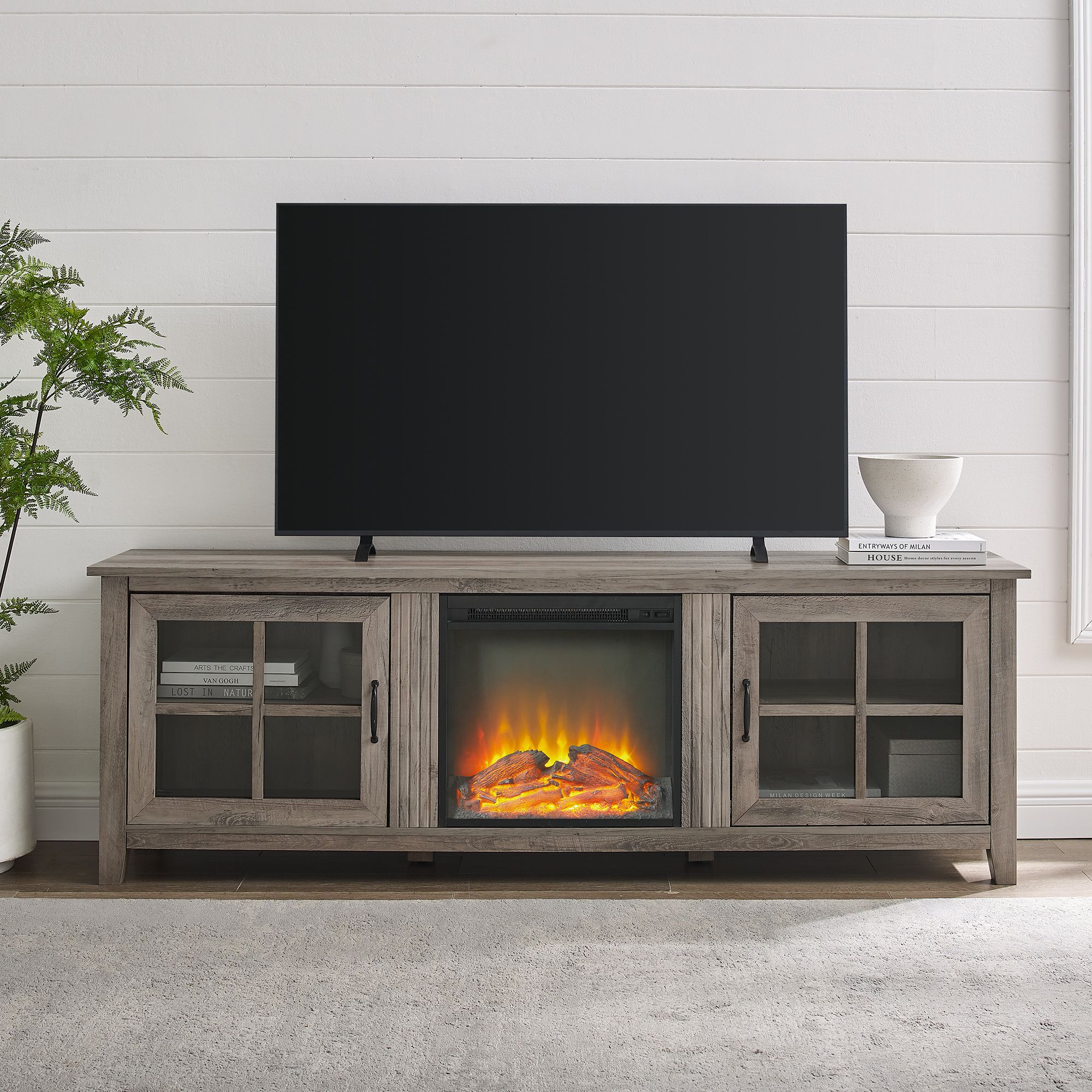 70 W Trends Deigo Fireplace Tv Stand Driftwood Bjs Wholesale