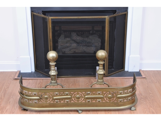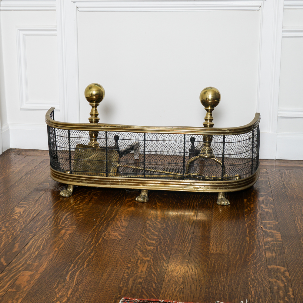 Brass And Wire Fireplace Fender With Andirons And Tools Ebth