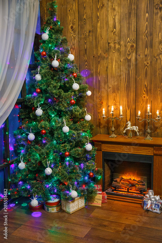 Christmas Interior With Toys And Lots Of Candles Wooden Fake