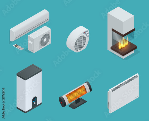 Home Climate Equipment Isometric Icon Set Fireplace Convector