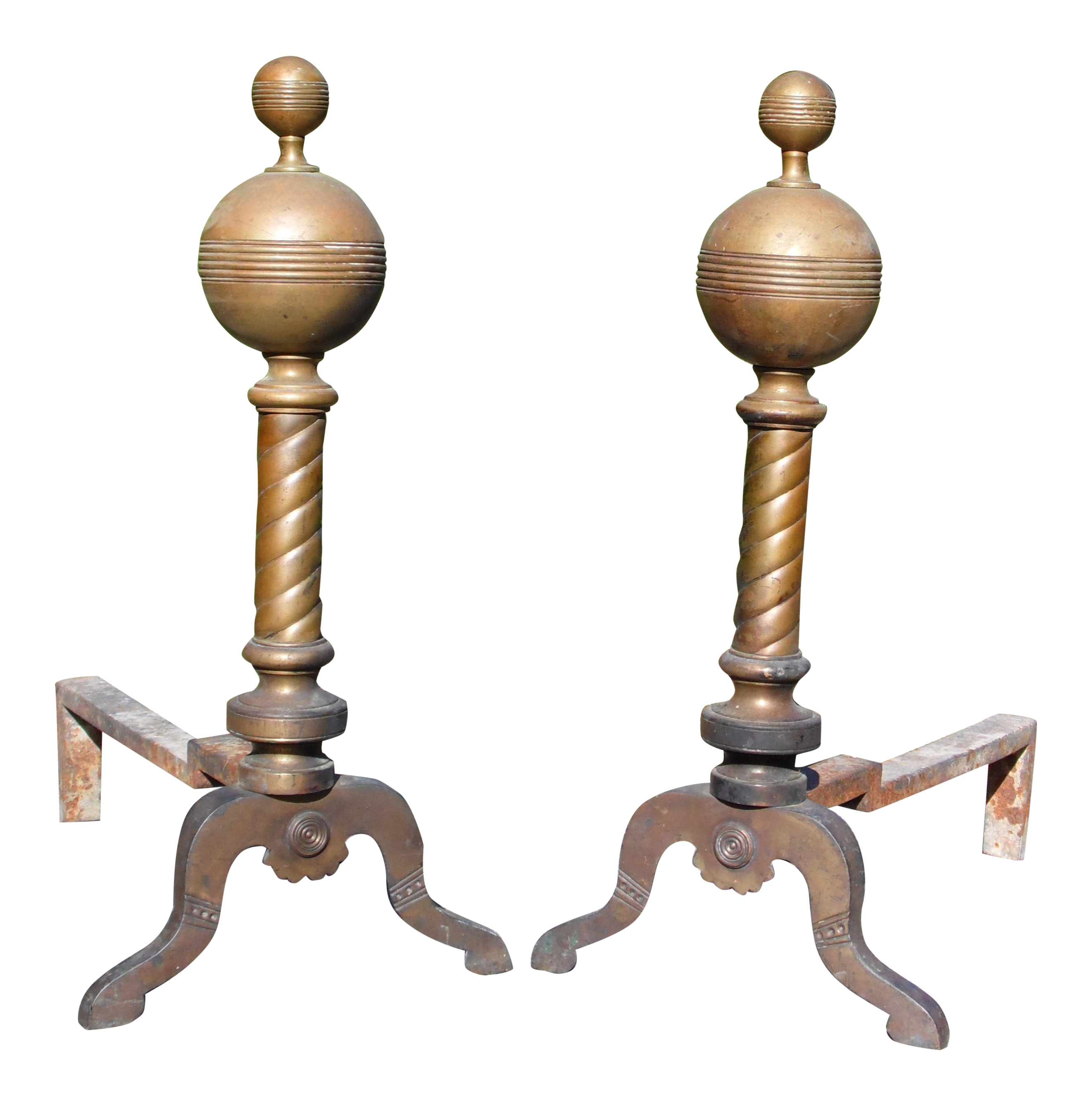 Antique Victorian Cannonball Brass Fireplace Andirons Fire Dogs