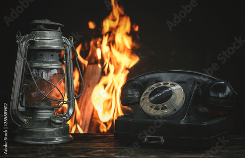 Black Old Phone And Kerosene Lamp On A Table On A Burning Fire In