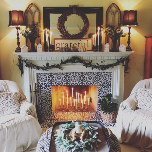 Cozy Moroccan Inspired Lounge Tile Accent Wall Fireplace Surround